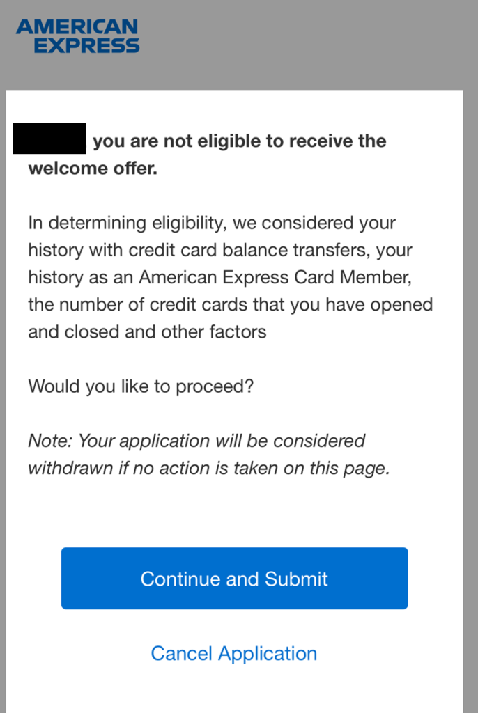 このメッセージが出ると、 カード自体は作れるけれど、サインアップボーナス(Welcome Offer)が一切もらえない という状態になります。